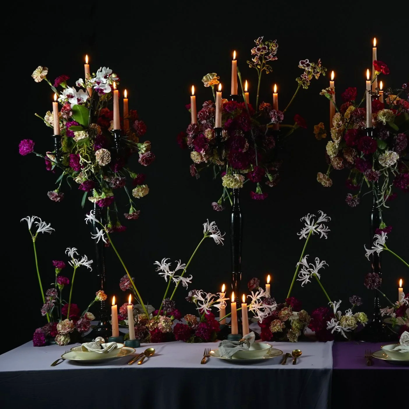 Centro de mesa Garden style en distintas técnicas sin espuma floral, candelabro y montaje de mesa imperial.
