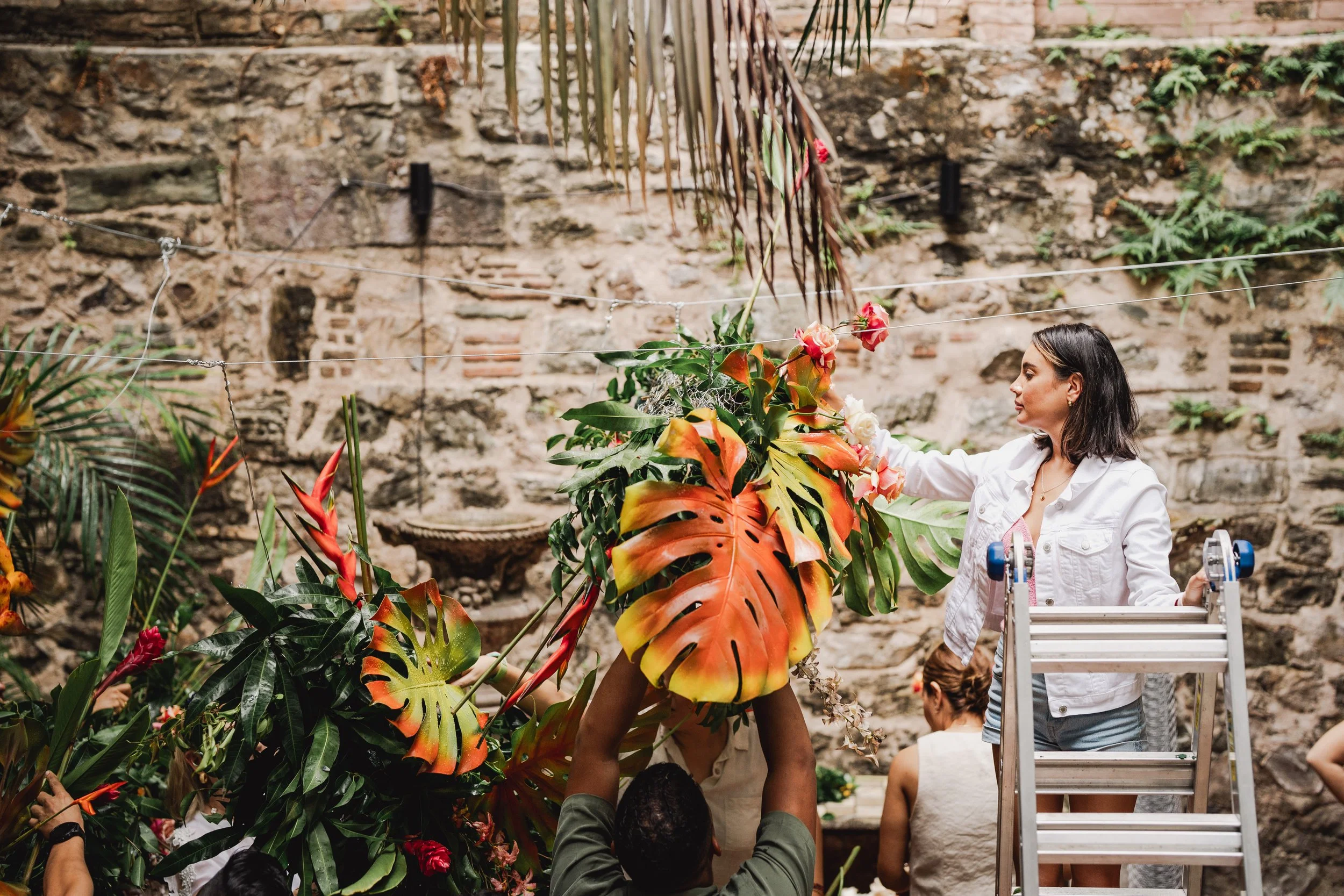 Mujer en escaleras arreglando plantas tropicales y flores en un jardín con muro de piedra.