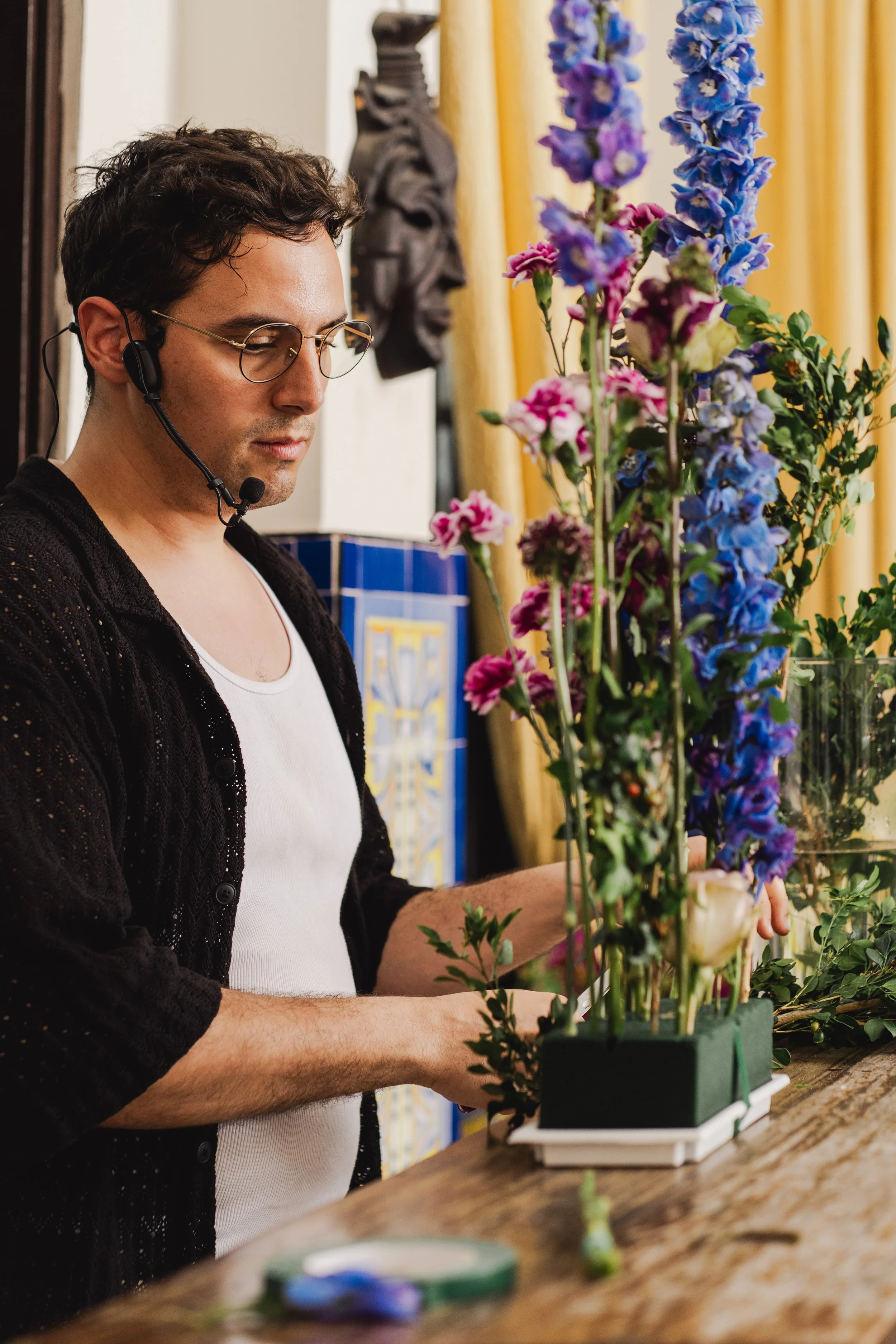 Un hombre arreglando arreglos florales con auriculares en un taller decorativo.