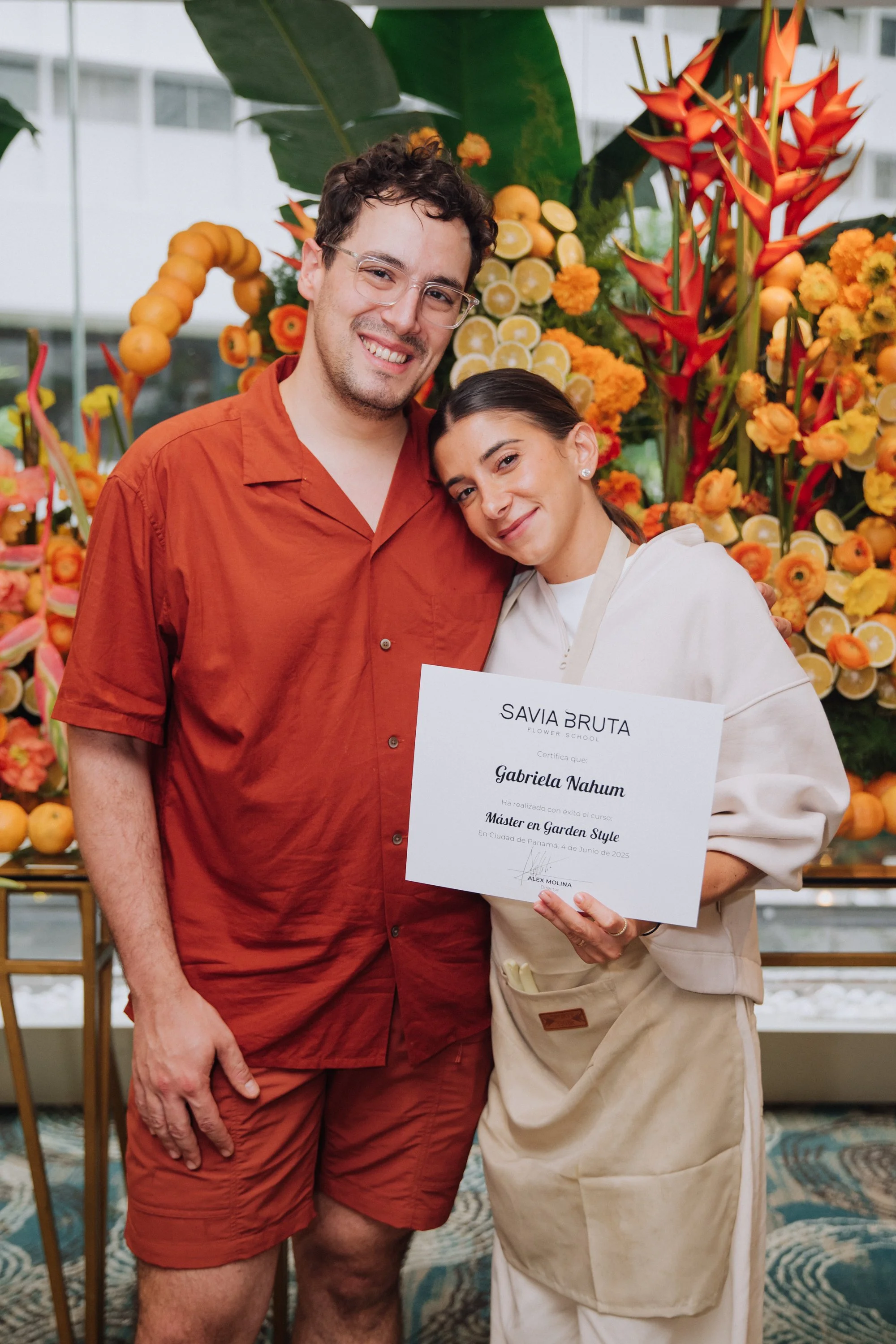 Una mujer y un hombre posan juntos en un salón, la mujer sostiene un certificado que dice que Bernice Abadi completó un curso de estilo de jardín con éxito en una escuela llamada Savia Bruta.