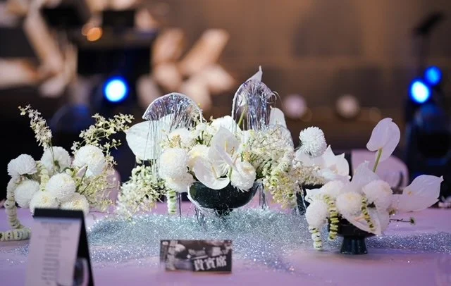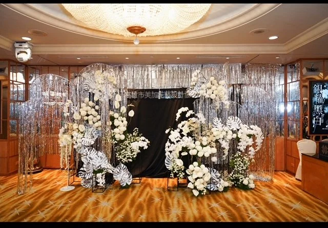 Decoración de evento con arreglos florales blancos, cortinas plateadas y fondo negro en un salón elegantemente decorado.