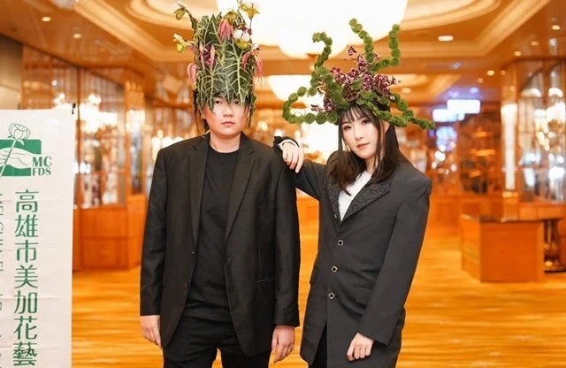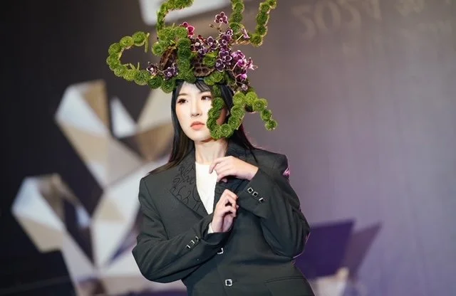 Mujer vestida con traje negro con un arreglo floral y plantas en la cabeza, en un escenario con fondo difuso