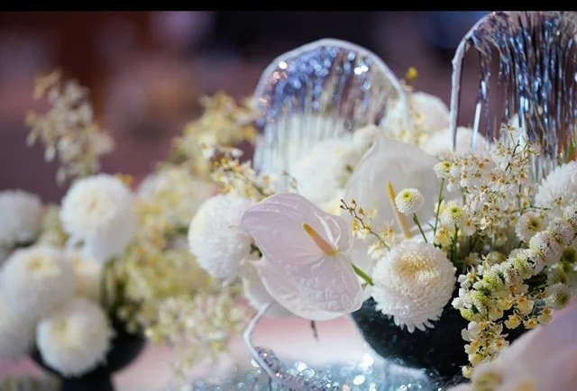 Centro de mesa con flores blancas y decoraciones de hielo en una mesa de evento.